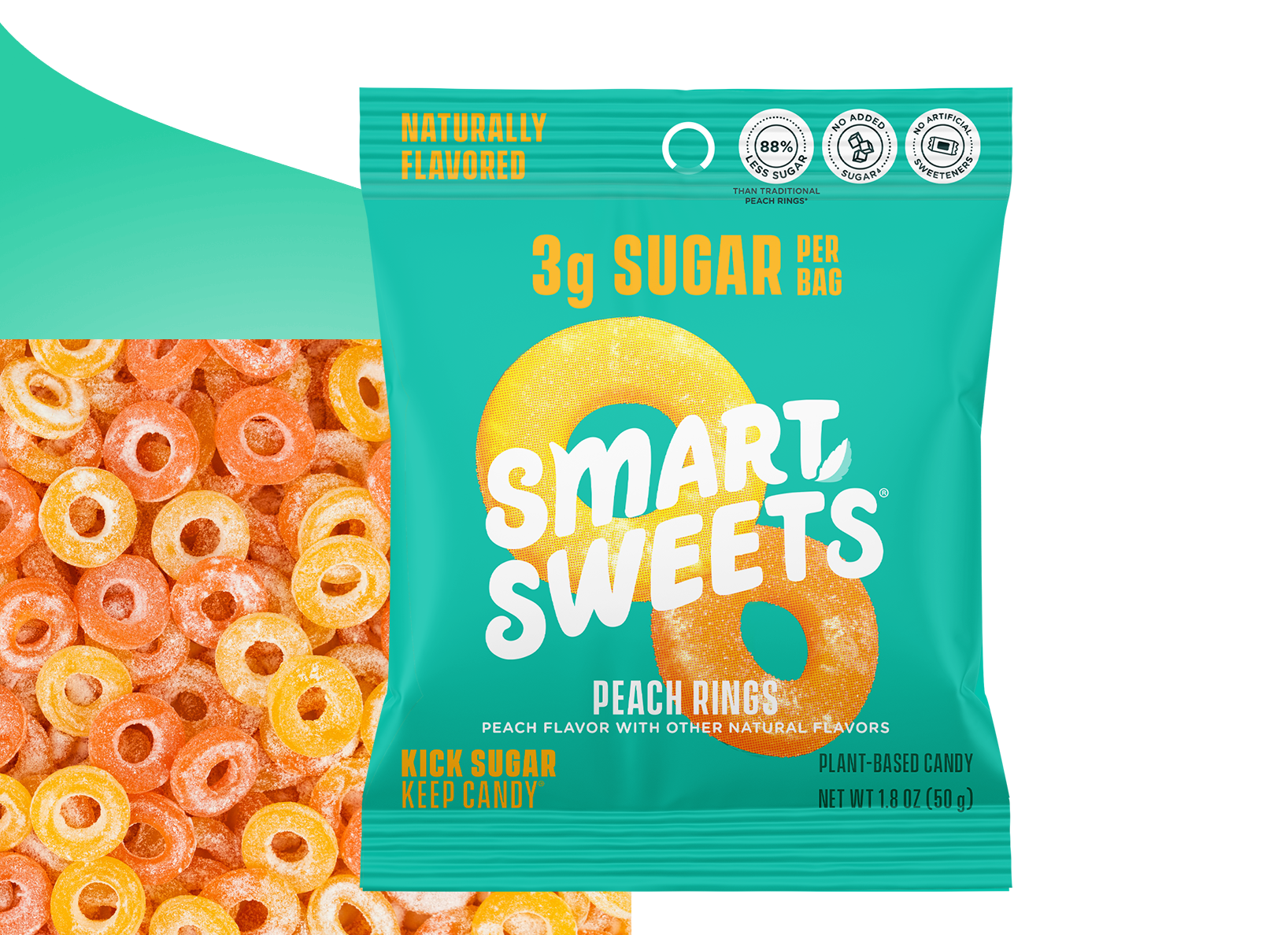 *SmartSweets Peach Rings 50g versus leading traditional candy equivalent