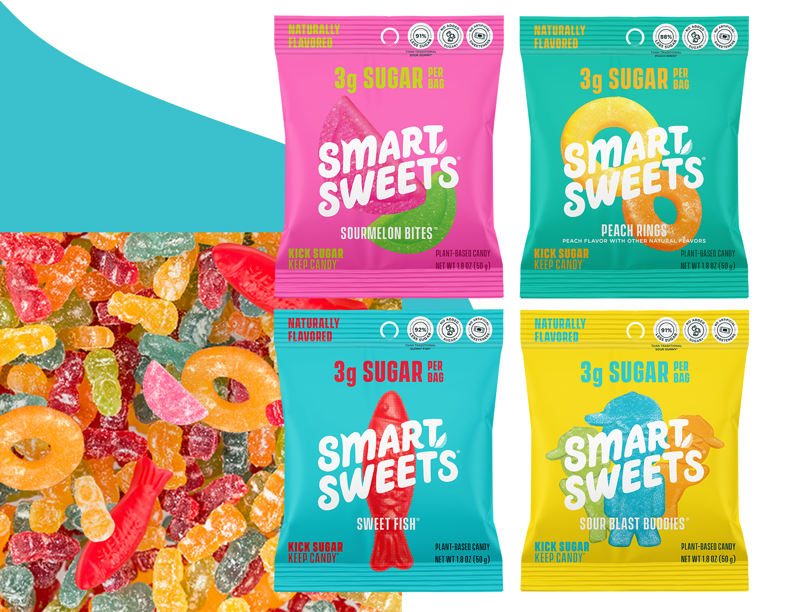 Contains two bags of each of your favorite SmartSweets - Sweet Fish, Sourmelon Bites, Peach Rings, and Sour Blast Buddies (8 total bags).